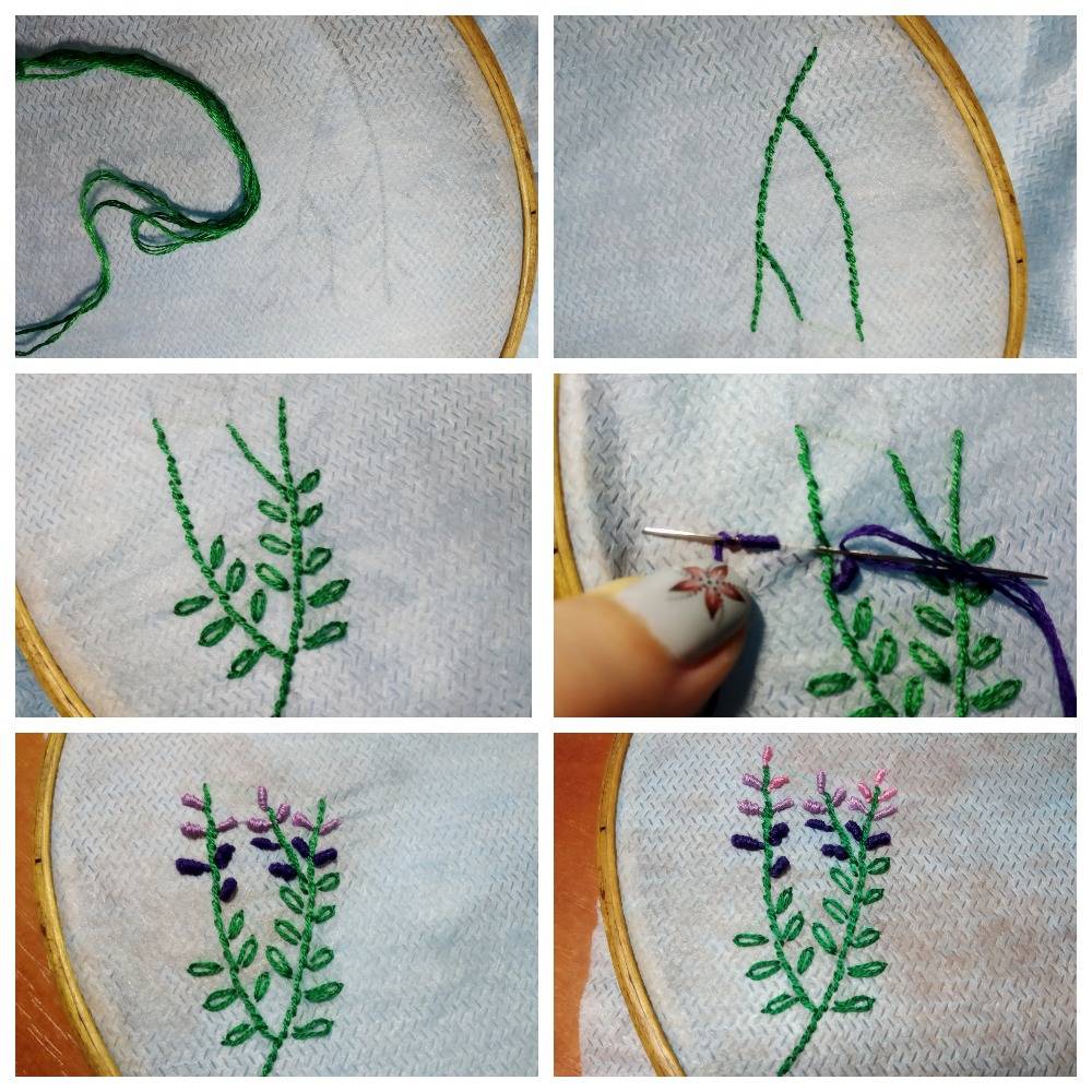 На фотографиях первая нить крепится микростежком. Сначала выполняется вышивка стеблей и всех зеленых деталей схемы. После этого вышиваются цветочки двумя оттенками мулине.