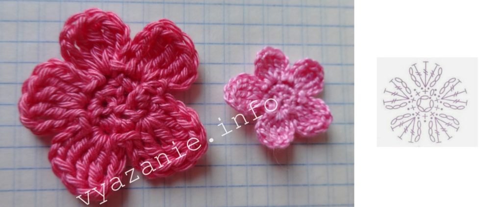 На фото маленький цветок связан нитками «Ирис» и крючком №1,25, большой нитками «Детский акрил» и крючком №3. Фото на тетрадном листе специально, чтобы видно было размеры.