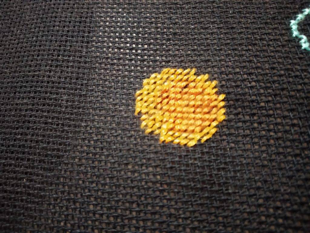 Вышивка ромашки на фотографиях выполняется полукрестом четырьмя цветами мулине: желтые и оранжевые нитки для сердцевины, белые и серые для лепестков цветка.