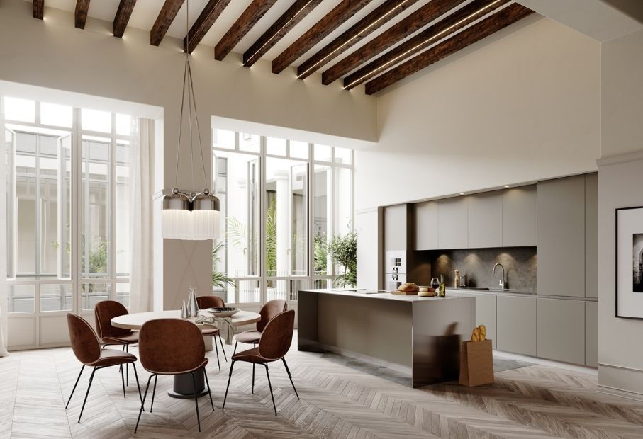 Вся техника (по максимуму) монтируется в мебель, вся кухонная утварь и предметы спрятаны во вместительных шкафах. Мебели минимальное количество, она как бы сливается с комнатой, не загромождая пространство. Стены отделывают венецианской штукатуркой, жидкими обоями или обоями под покраску. На полу паркет с простым геометрическим орнаментом или ламинат без яркой фактуры.