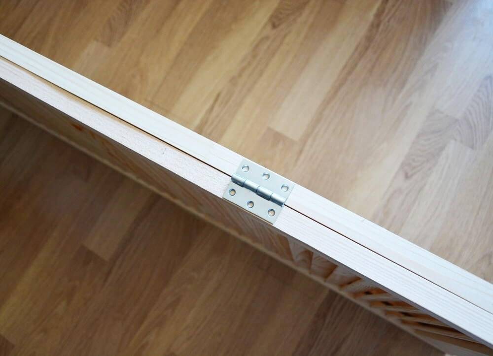 Работу начинают со сборки рам каркаса. Бруски необходимо подогнать по размерам створки и соединить в рамы. При скреплении брусков следует пользоваться угольником, чтобы соблюсти прямой угол и не допустить перекоса створок. Между собой элементы рамы соединяют посредством саморезов или гвоздей. Готовые конструкции покрывают лаком и оставляют до полного высыхания покрытия.