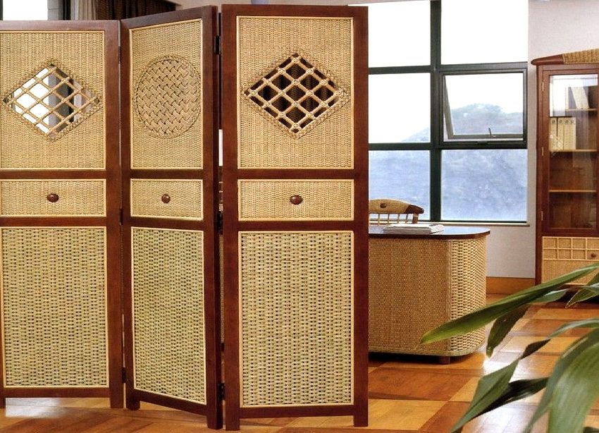 Облегченным вариантом деревянных перегородок являются ширмы, искусно созданные из ротангового или ивового плетения. Приятные и спокойные расцветки изделий от янтарной до оливковой подчеркнут натуральность в интерьере. Украсив изысканные и невесомые ширмы из бамбука вьющимися комнатными растениями, их можно использовать как декор, стилизованный под садовую беседку.