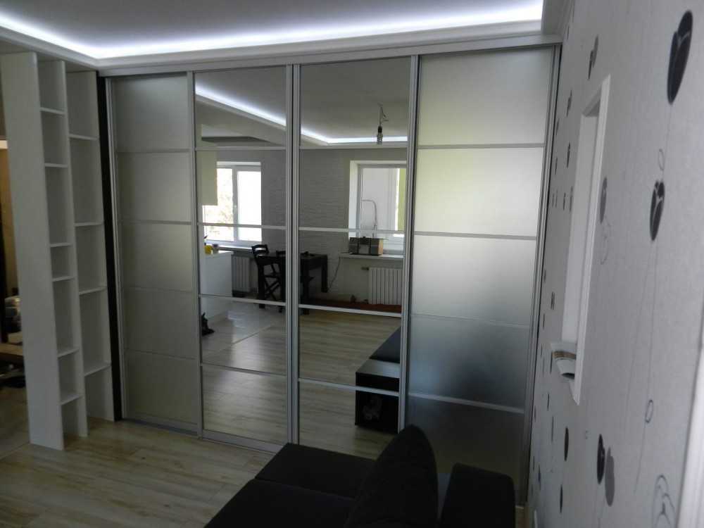 Такие модели будут стоить подороже, но их стиль и неприхотливость в уборке того заслуживают. На стекло часто наносят необычные рисунки, комбинируют цвета или устанавливают на одной из дверей зеркало в полный рост.