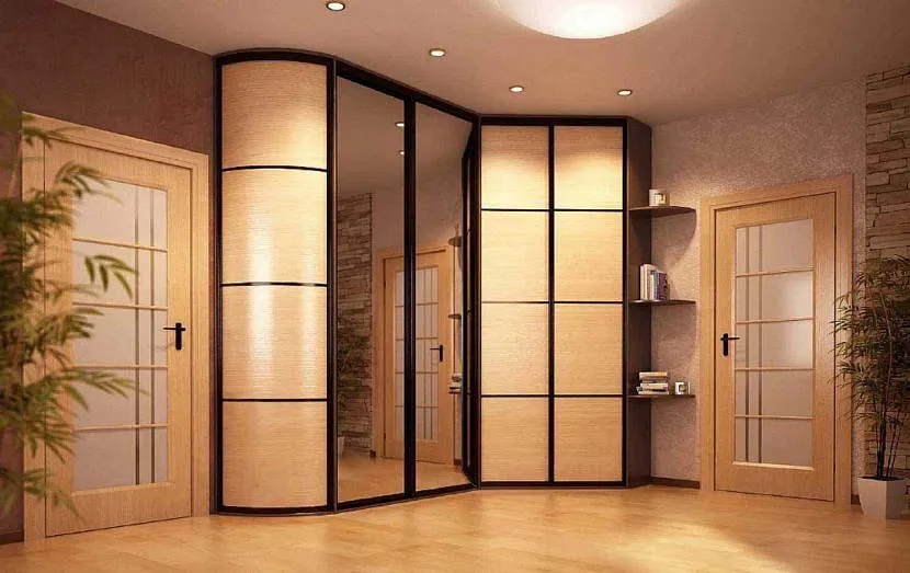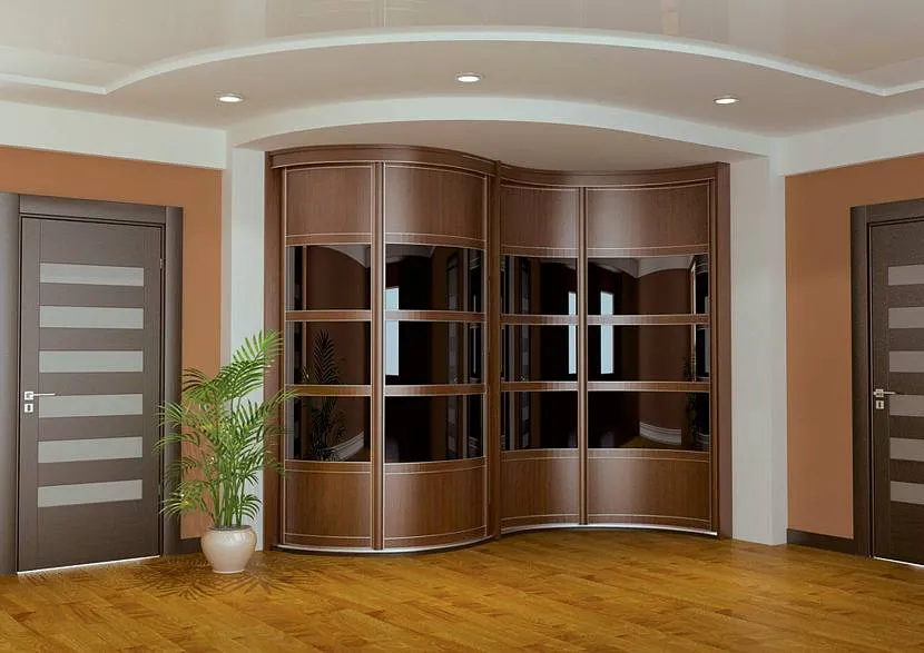 Радиусные шкафы выглядят оригинально и непривычно. Они бывают вогнутыми, выпуклыми, комбинированными (волнообразными), круглыми и угловыми. Благодаря разнообразию форм, есть возможность выбрать радиусную модель для помещения любой площади и конфигурации. Например, угловой вариант лучше всего будет смотреться в небольшом помещении, а вогнутая или выпуклая модель в углу просторной прихожей. Эффектно выглядит волнообразный шкаф.
