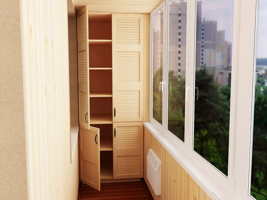На узком балконе самым практичным и удобным будет вариант углового шкафа от пола до потолка. Такая конструкция создаст красивый дизайн и позволит рационально использовать угловое пространство, уместив множество вещей. Также не забывайте, что светлые оттенки зрительно увеличивают площадь.