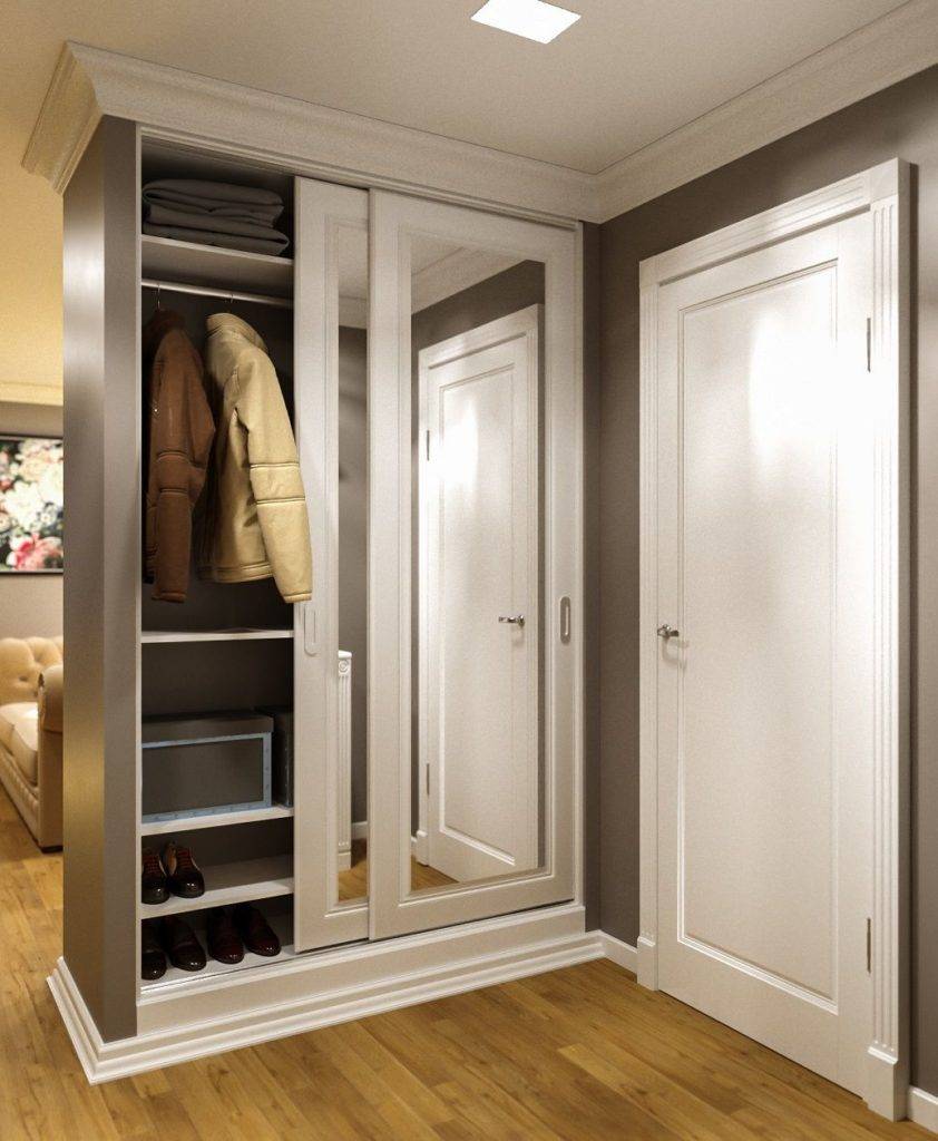 Если же для установки пристенного шкафа не хватает ширины помещения, то можно сделать в прихожей встроенный угловой шкаф.