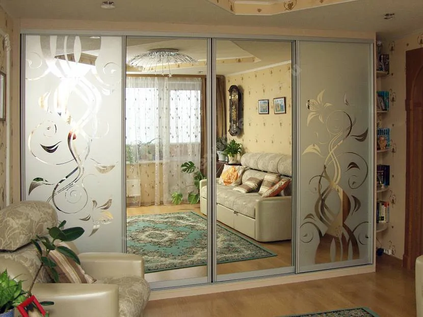 На фото – рисунок пескоструем шкафа купе в гостиной.