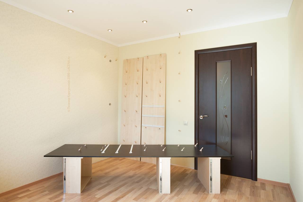 На фото часть деталей шкафа-купе и не видно дверей, — они в коридоре стоят, чтобы не мешать сборке.