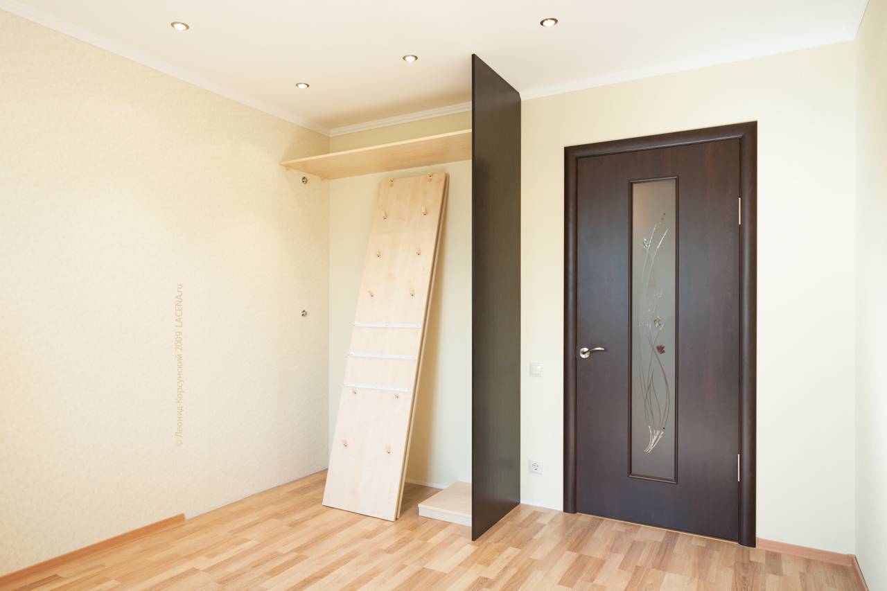 У встроенных шкафов-купе верхний рельс дверей-купе будет крепиться прямо к потолку. Если вы планируете делать натяжной потолок, подумайте заранее о закладной в этом месте, потому что повесить что-либо на полотно натяжного потолка невозможно. Нижний рельс, логично, будет крепиться к полу. Подумайте о нагрузке на пол. Возможно, двери шкафа-купе получатся довольно тяжелыми, к примеру, если вы выберите наполнение из стекла. Неграмотно сделанная подложка под напольное покрытие рискует провиснуть — учтите это еще на этапе ремонта.