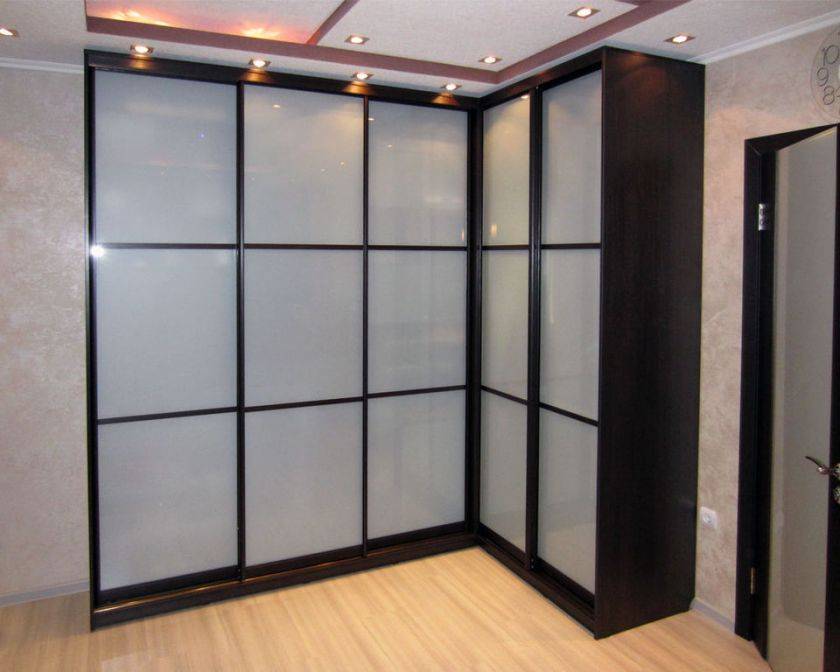 - Угловые. Не менее популярный вид позволяет разумно использовать угол помещения. Одна из вариаций – диагонально-угловая модель-купе. У нее округлый фасад, декорированный зеркалом, непрозрачным или рифленым стеклом. Сейчас модно размещать угловые модели в спальне.