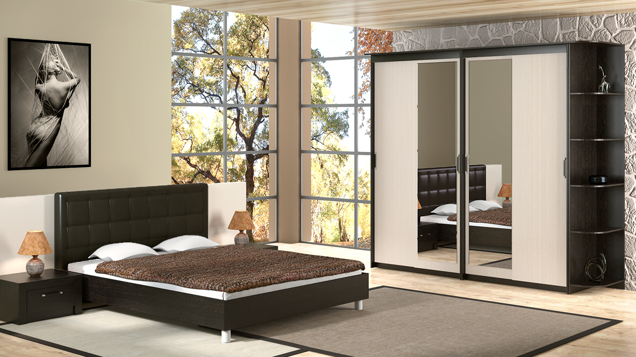 - зеркальные поверхности — благодаря зеркальным дверцам шкафа можно зрительно увеличить спальню, а также в этом случае нет необходимости приобретать дополнительно большое зеркало и ставить рядом с кроватью. Такие двери очень популярны;
