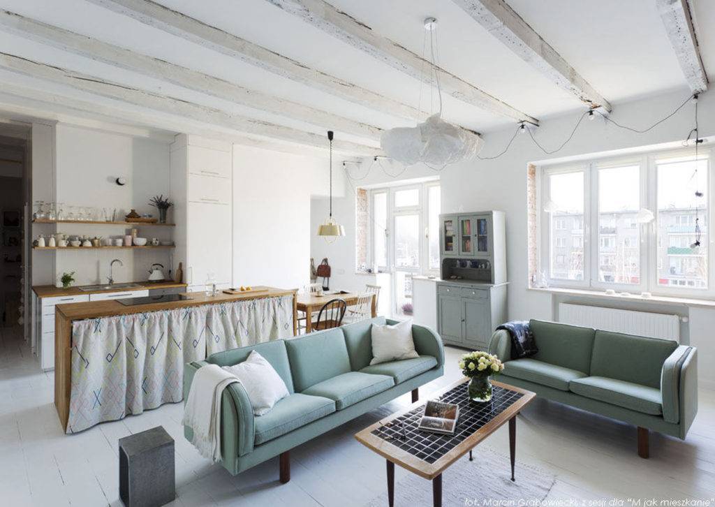 Скандинавский стиль сильно основан на эклектике (сочетании разных стилей), которая проявляется в том, что дома часто обставляют винтажной мебелью. Безусловно, она играет роль интересных дополнений, точно сочетая прагматичный и современный подход с традициями. Поэтому в светлой просторной гостиной часто можно встретить старые стулья или старый сервант.