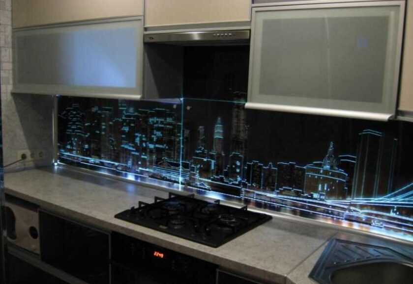 Если вы хотите всегда производить впечатление на гостей и любите необычные дизайнерские решения, присмотритесь к стеклянным скинали с подсветкой. Добавить неординарности интерьеру поможет фотопечать изображения вечернего вида на один из мегаполисов. Вечером вы сможете наслаждаться видом Парижа или Нью-Йорка, попивая чай или кофе.