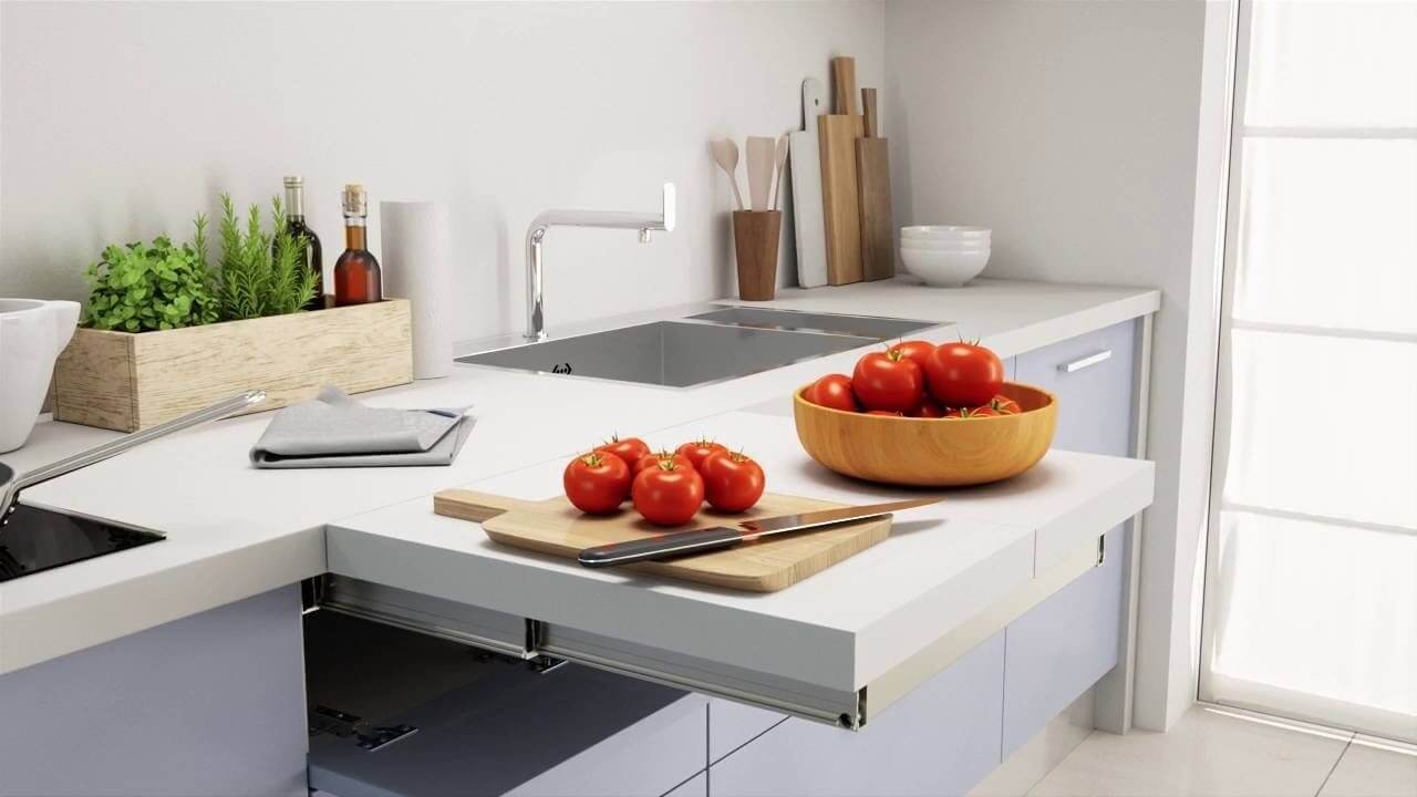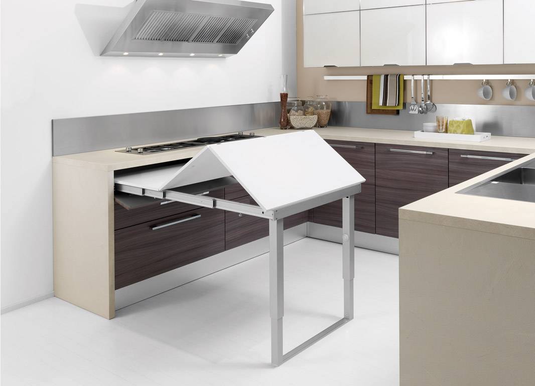 Кухонный гарнитур с выдвижной столешницей — вариант практичный и функциональный. Дополнительные столешницы удобны в использовании и могут служить миниатюрным столиком для пары. Стильные модели не только сэкономят свободное место, но и сделают интерьер ярче и интереснее.