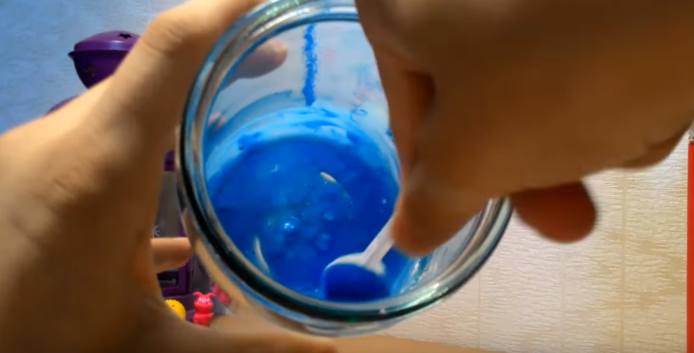 - Добавьте в клей краситель и блёстки (по желанию), а также 2 ч. л. воды. С помощью ложки перемешивайте массу до однородного оттенка.