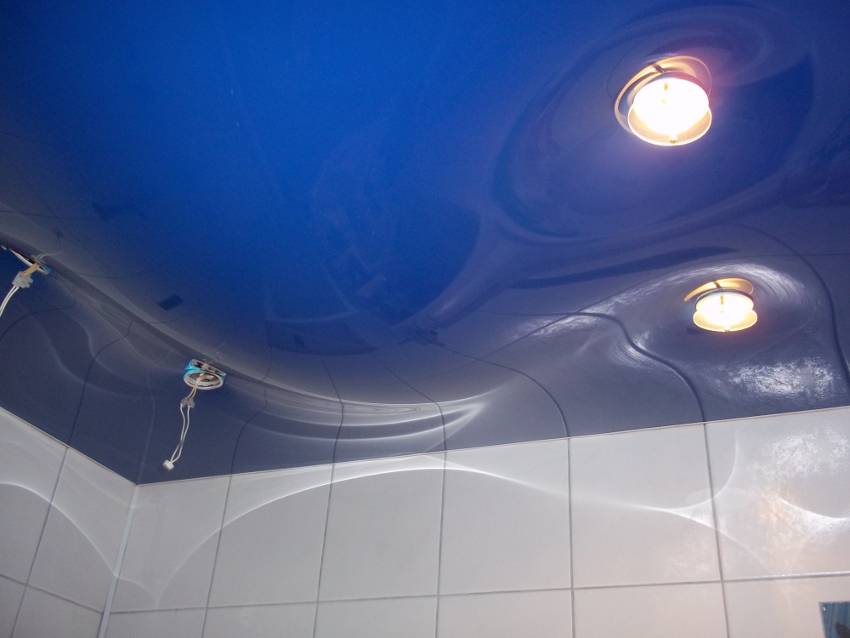 Для этих комнат в самый раз подойдут ПВХ-потолки, а уж глянцевые или матовые значения не имеет. Поливинилхлоридная пленка не пропускает воду ни капли и способна выдержать 100 литров воды одномоментно, лишь сильно растянувшись и образовав огромный пузырь. Такая пленка не порвется, так как она очень прочная. Риск разрыва есть в том случае, если затапливаться комната будет горячей водой, под воздействием которой пленка еще сильнее растянется и может прикоснуться к какому-то острому предмету или углу мебели, тогда произойдет надрыв пленки.
