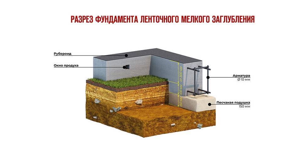 При слабо несущих или каменистых грунтах, там где невозможно поставить свайный фундамент металлический или бетонный, применяется монолитный ленточный фундамент мелкого заглубления.