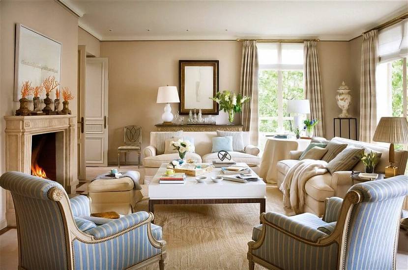 Идеально решение для оформления классических гостиных и спален – светло-бежевый фон стен. Если умело использовать тёмную гамму штор и мебели, можно получить идеальные решения в стилях модерна и классики.