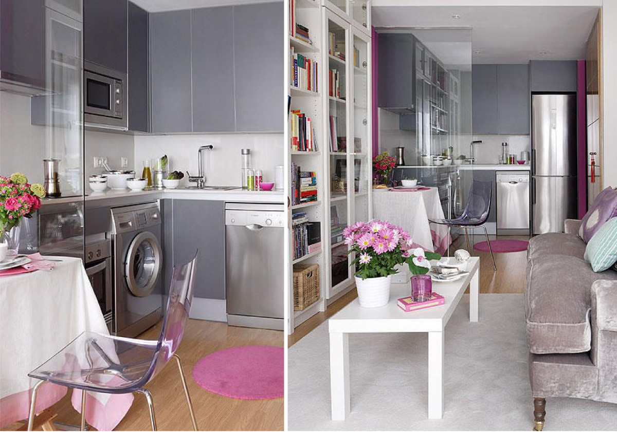 В малогабаритных кухнях предпочтительно применять светлые комбинации — ваниль, молочный, бежевый, светло-серый, мятный, нежно-розовый и пр. А вот в больших комнатах и тем более квартирах студиях можно использовать более яркие и контрастные варианты. Если кухонная зона совмещена с гостиной, она может контрастировать с ней, либо гармонировать. Контраст удобен, если нужно визуально разграничить кухонное пространство и гостиную.