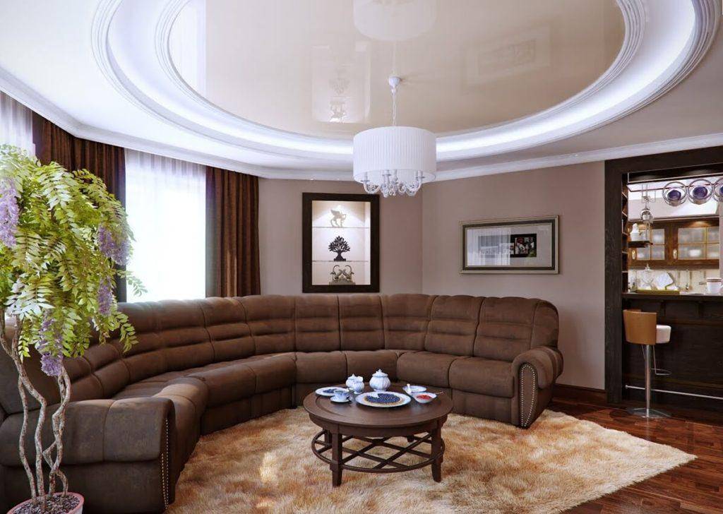 Бронза в современной гостиной — минималистичный стиль гламура. Такой декор позволит обставить элегантную гостиную. Доминирующие цвета — черный, белый и коричневый. Со светлым полом и темным диваном коричневый коврик и другие аксессуары идеально сочетаются. Зона гостиной с темно-коричневым диваном вписывается в светлый ковер.