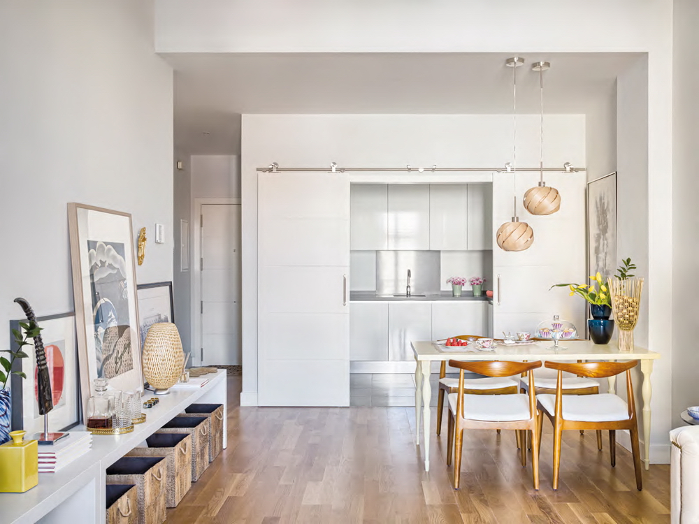 На фото — квартира-студия со встроенными местами для хранения, скрытыми от глаз.