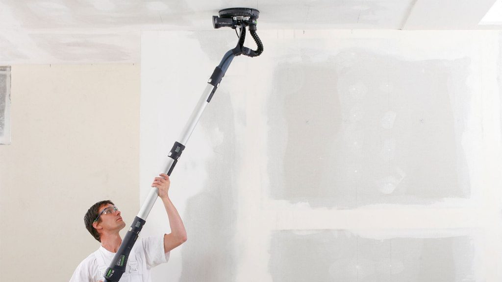 В завершение поверхность гипсокартона шлифуется наждачной бумагой подходящей степени зернистости либо шлифовальным аппаратом с насадками. Рекомендуется проверить наличие неровностей с помощью искусственной подсветки. Работы по шлифованию выполняются в защитных очках и респираторе.
