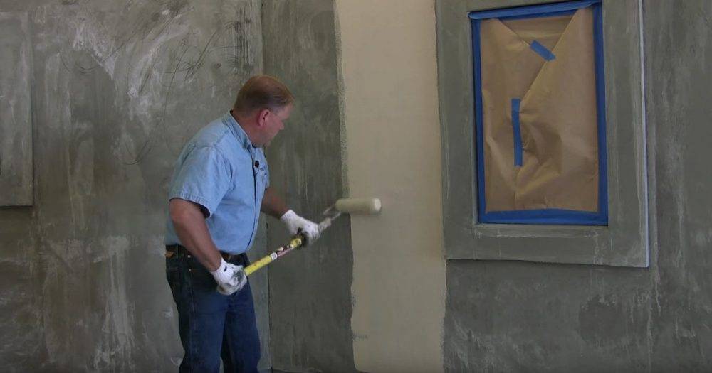 Затем валиком или кисточкой раствор наносится на поверхность. Если его вязкость большая, то нужно добавить воды, чтобы довести до необходимой консистенции.
