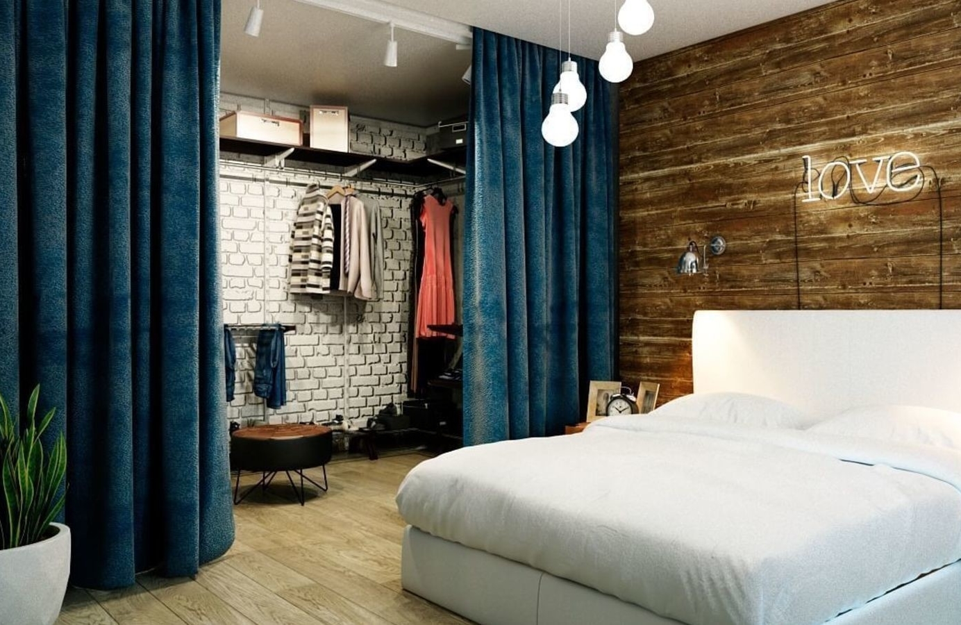Наиболее популярный вариант – это гардеробная, совмещенная со спальней. Особенно актуально это для больших помещений.
