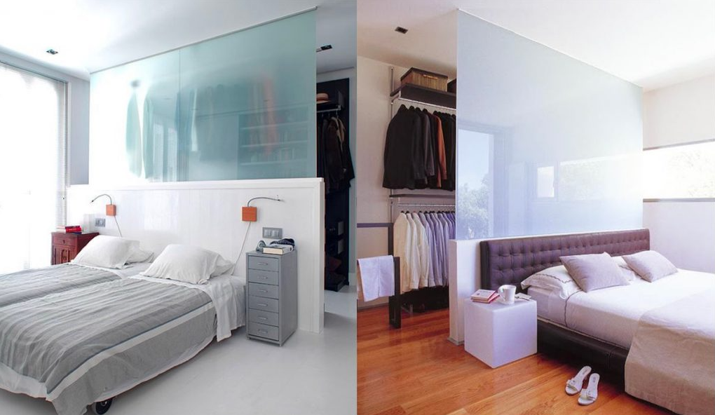 Дизайн спальни, совмещенной с ванной, включает в себя прозрачные раздвижные перегородки из стекла, позволяющие защитить помещение от брызг. Такие перегородки позволяют создать невесомое ограждение, которое не бросается в глаза и не утяжеляет пространства. Отгородить гардероб можно также при помощи перегородок.