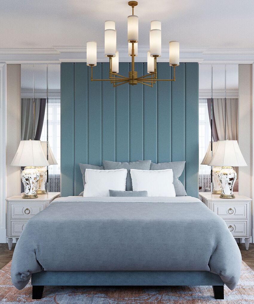 Спальня в синих тонах, фото современного убранства с элементами классики
