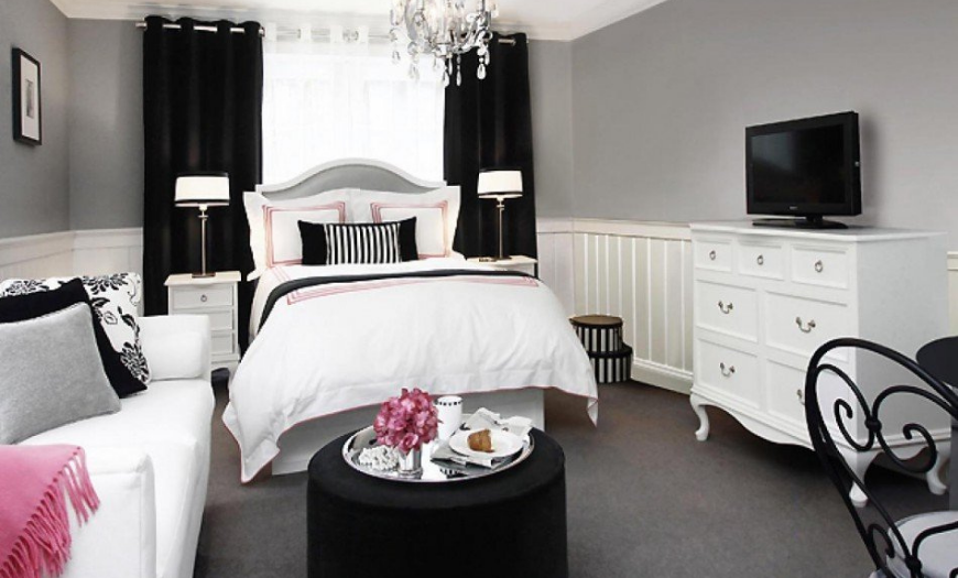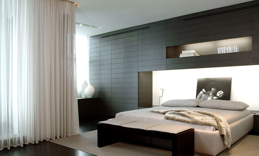 Основным предметом мебели в такой комнате является, конечно же, кровать. Как правило, это современная практичная конструкция, чаще выполненная в минималистическом стиле. Иногда она располагается на подиуме и дополняется своеобразным балдахином, напоминающим металлический каркас или оригинальным изголовьем.