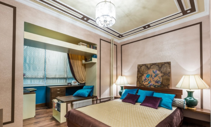 При наличии балкона в спальне рекомендуется его утеплить и объединить с основным помещением. Дополнительную площадь можно приспособить под зимний сад, рабочий кабинет или гардеробную. Для зонирования пространства используйте подоконную тумбу: поставьте на нее горшочные растения и ночник.