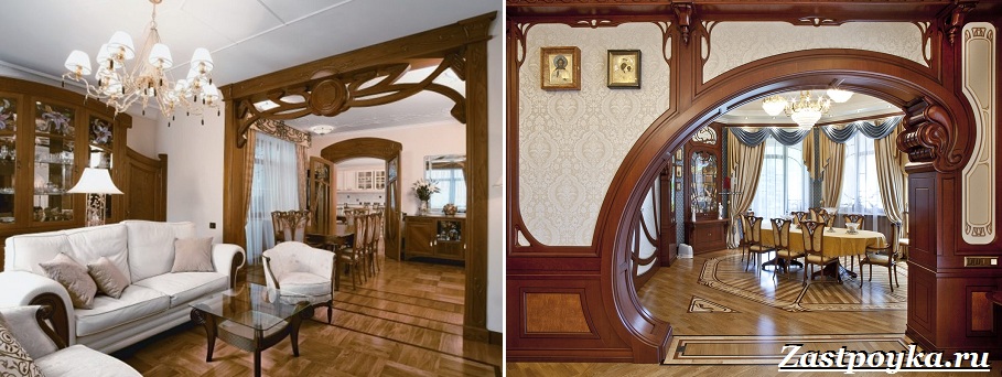 Дверные проемы и оконные рамы могут иметь художественную роспись растительными орнаментами, с элементами витража, создающего волшебную атмосферу за счет бликов солнечного света. Арочные конструкции окон, проемов, каминов, шкафов, и диванов становятся символом декора модерн.