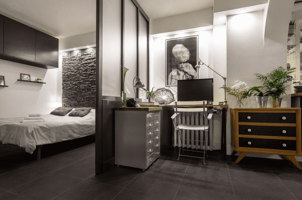 Совмещение рабочей зоны и зоны отдыха встречается часто. Оптимальным считается разделение помещения в пропорции 1 к 2, где большую часть занимает спальная.