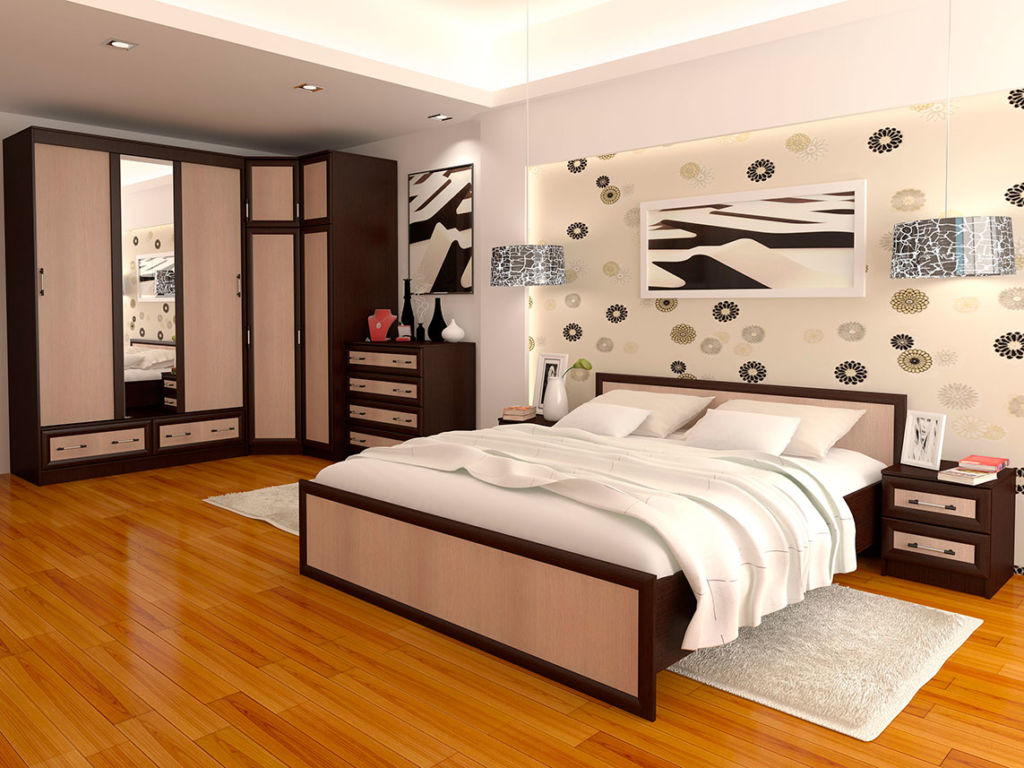 Стандартный набор мебели для спальни модерн – кровать, прикроватные тумбочки, зеркало, туалетный столик, комод