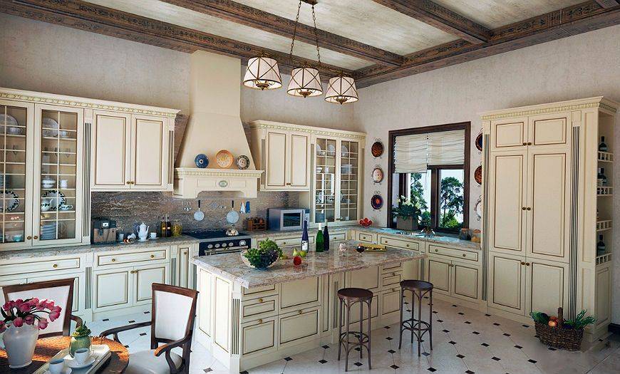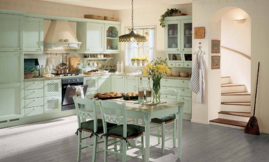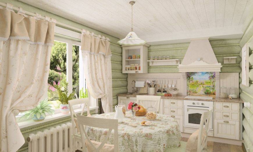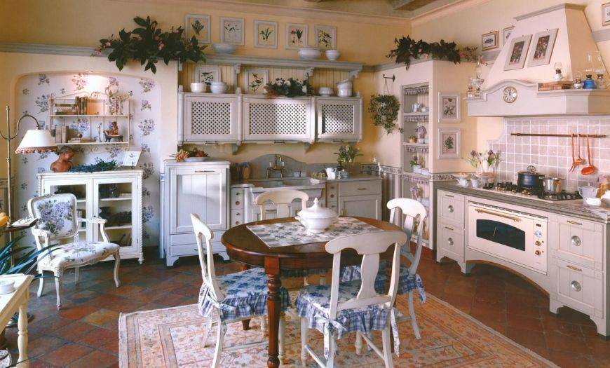 Интерьер кухни в стиле кантри и прованс – это присутствие различных декоративных орнаментов в текстиле и отделке стен: