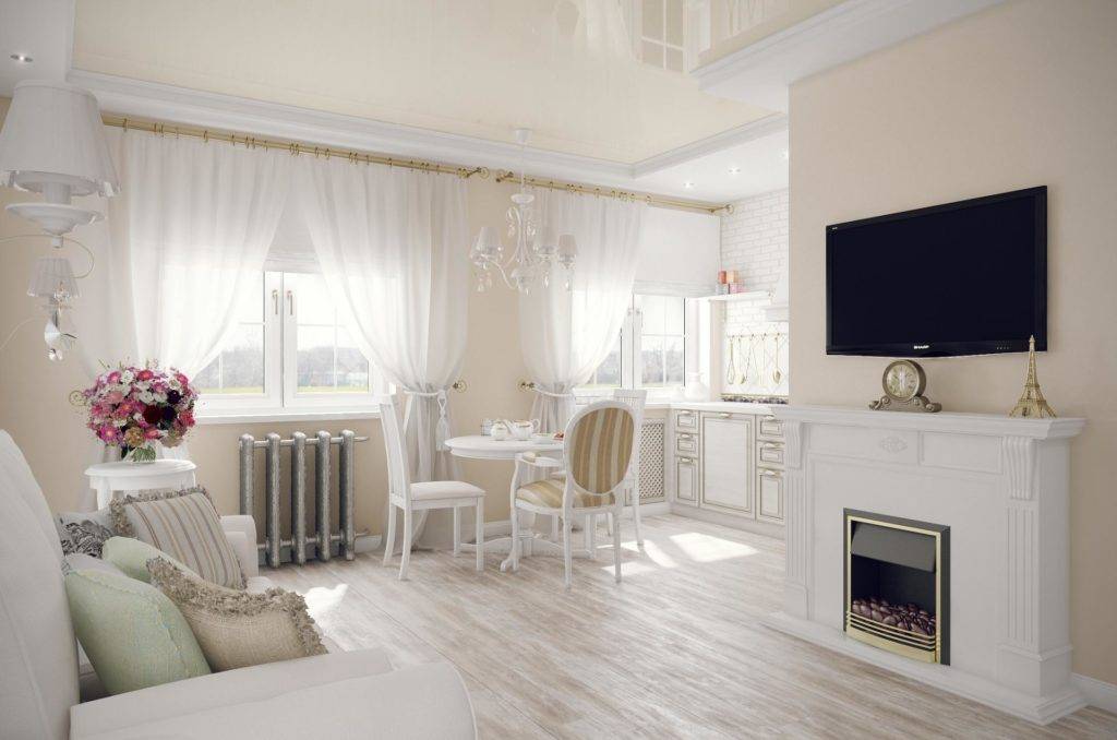 Для квартиры подойдет отделка стен декоративной штукатуркой. Потолок лучше побелить и повесить на него тяжелую люстру со стеклянными или хрустальными подвесками. В них будет красиво играть свет.