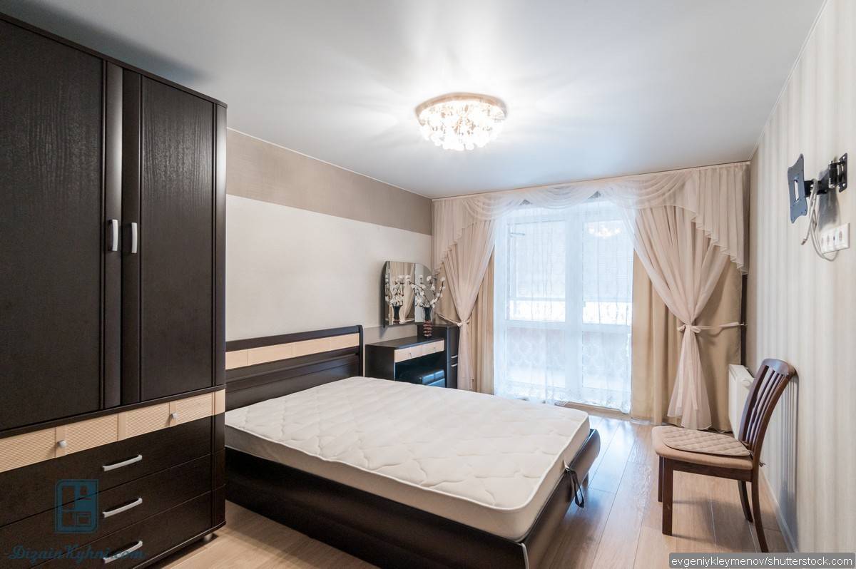 Пол в спальной комнате выкладывают коричневым паркетом или оформляют ковролином серо-черного оттенка.