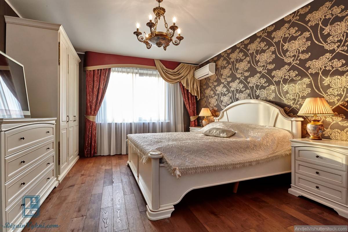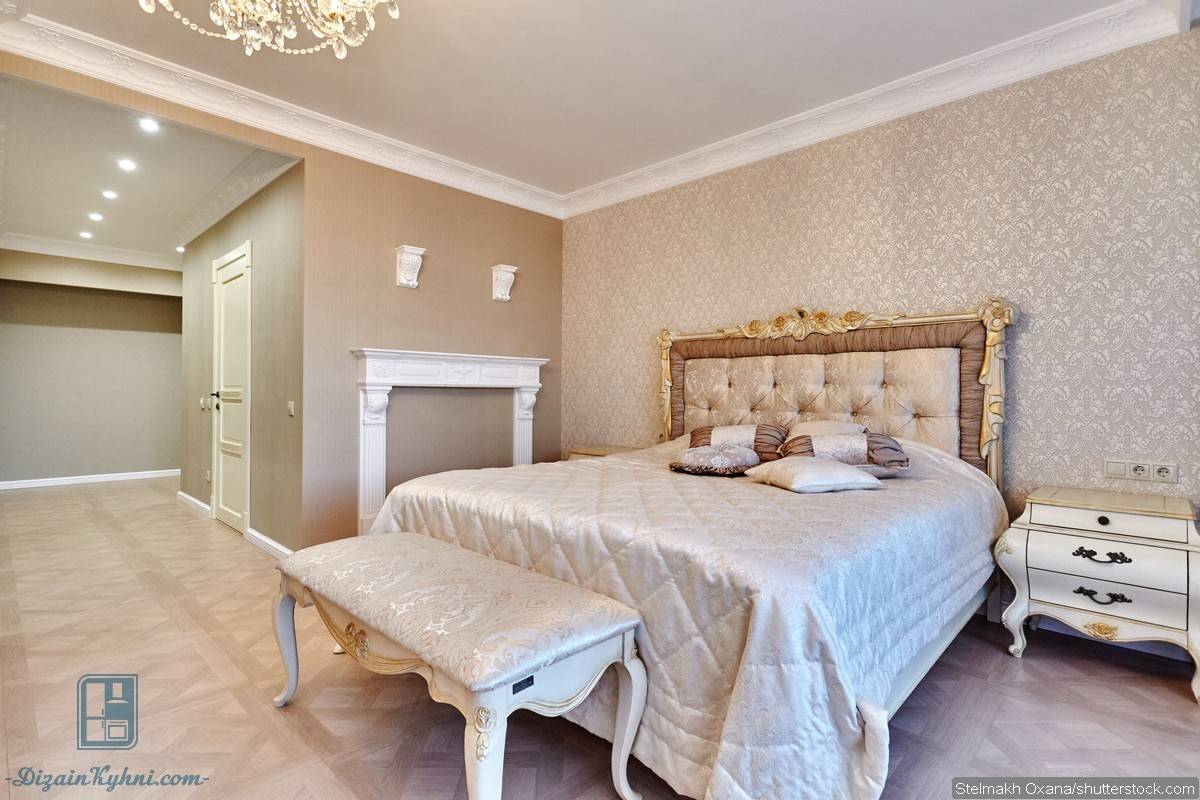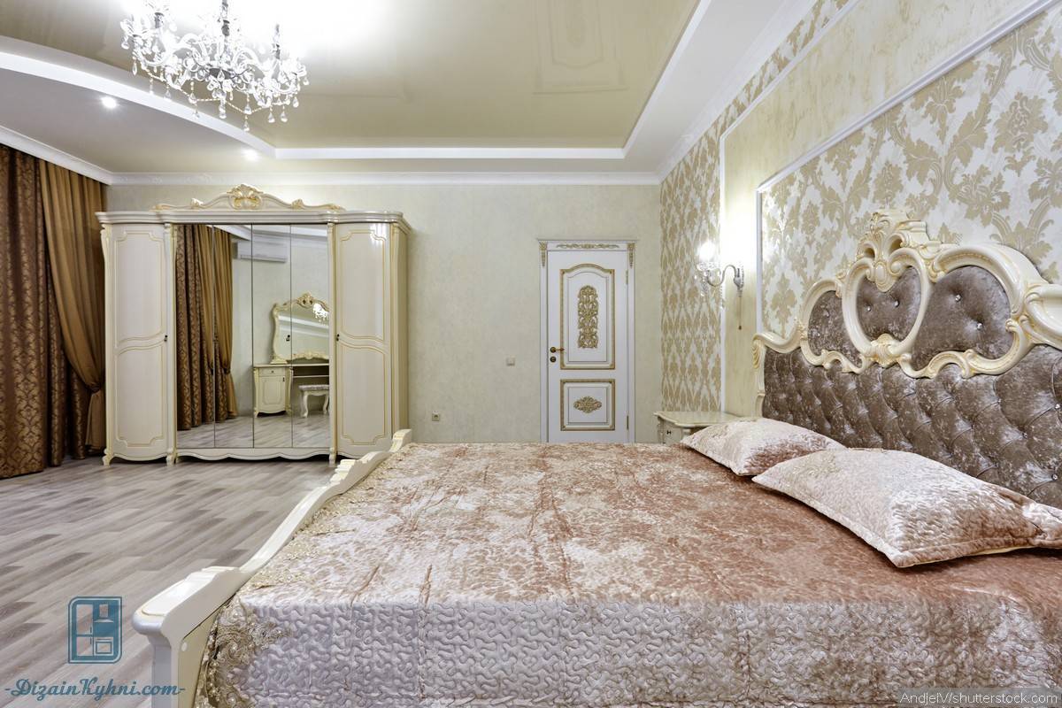 Роскошный стиль с вычурными элементами мебели и декора. В оформлении используются теплые тона, в частности, золотой. Обои используются с мелким рисунком, не выделяющиеся из общего цвета. Искусно сделанная лепнина украшает потолок, на котором располагается пышная стеклянная люстра. Изголовье кровати, зеркало, прикроватная банкетка, столы напоминают о временах царей и цариц. Наслаждаться отдыхом в такой спальне смогут любители настоящего лоска.