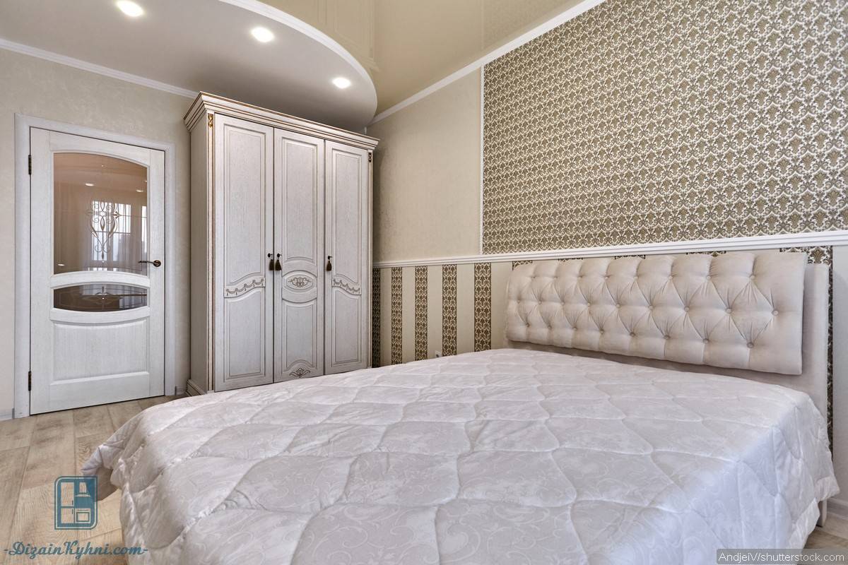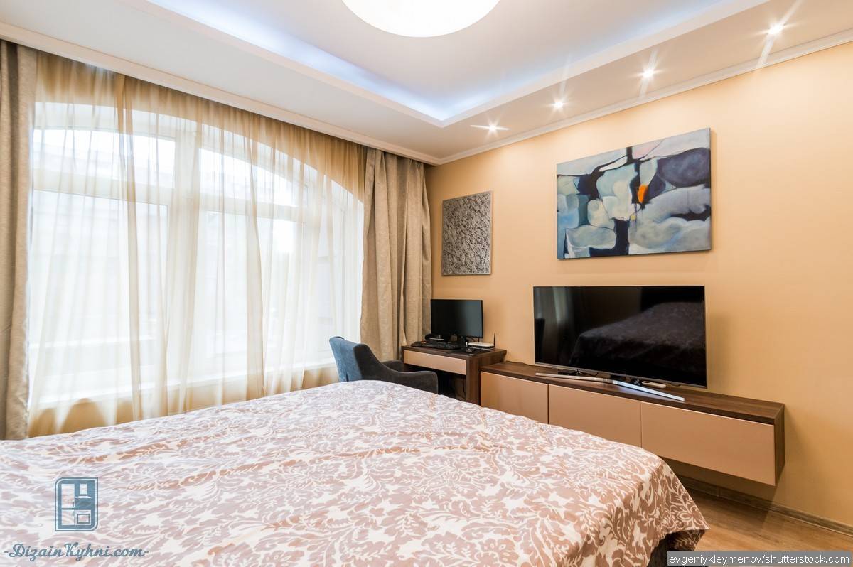 Достаточно прост в исполнении, но выглядит элегантно и удобно. Оформление помещения выдерживается в спокойных цветах, где преобладают бежевый, коричневый и золотой. Такая спальня предназначена исключительно для отдыха.