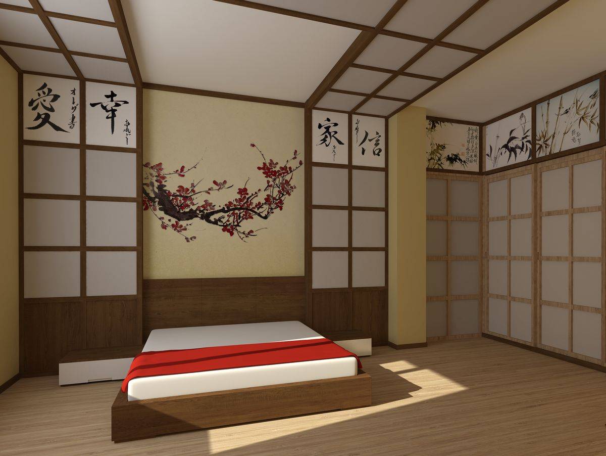 Светильники выбирать объемные, шаровидной или прямоугольной формы. Мебель также лучше выдерживать в стиле: низкая кровать, миниатюрные столики, перегородки. Потолок украшается деревянными перекладинами, в которые можно установить световые приборы. В такой спальне должно быть много открытого пространства. Вместо штор на окна устанавливаются жалюзи или японские шторы. Японский стиль предпочитают люди, склонные к духовным практикам и погружениям в собственные мысли.