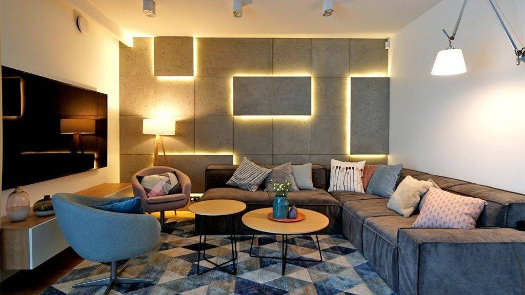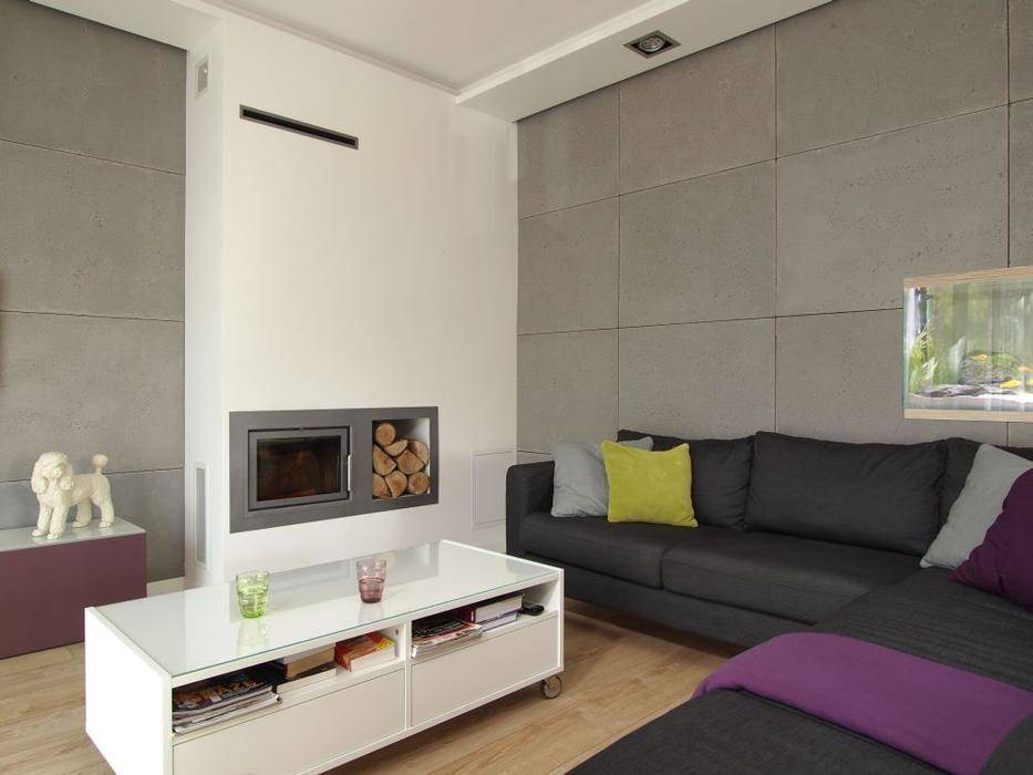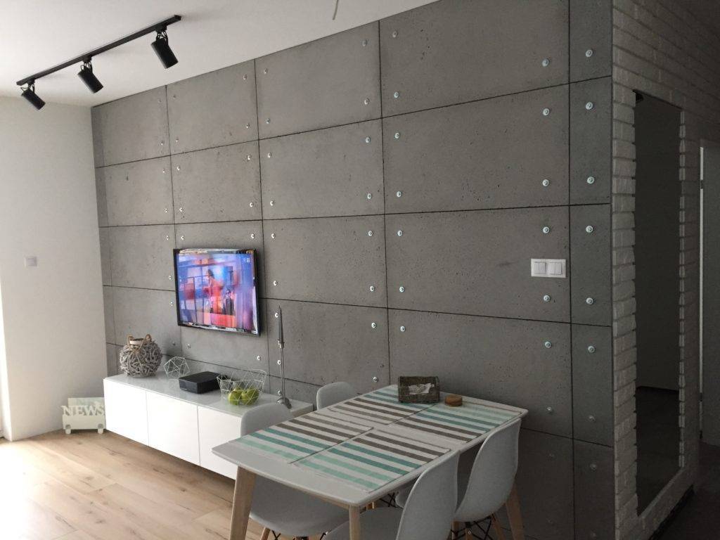Бетонная стена в гостиной может быть выполнена из архитектурного бетона в виде готовых декоративных панелей. Более дешевым, но также и эффективным решением является использование структурных красок или штукатурок, которые придают поверхности характерную шероховатую структуру и серый цвет.