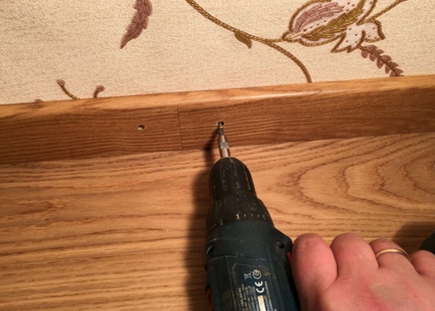 - выполняется вкручивание саморезов, действие выполняется не до конца, а только до появления кончиков крепежного изделия с обратной стороны плинтуса;