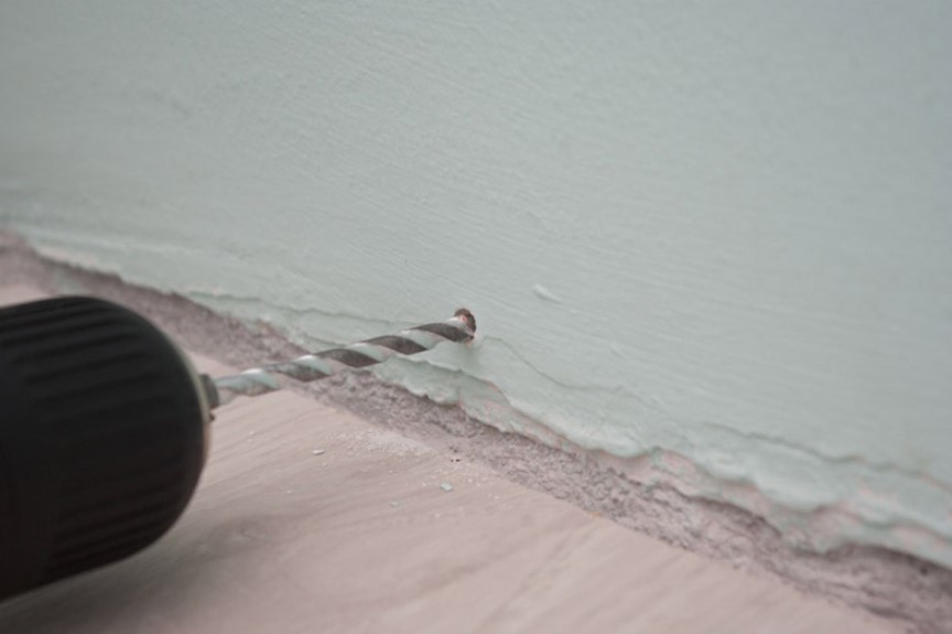 Уберите деревянный плинтус и перфоратором по разметке насверлите дыры под дюбеля. Диаметр победитового сверла должен быть равен сечению дюбелей.