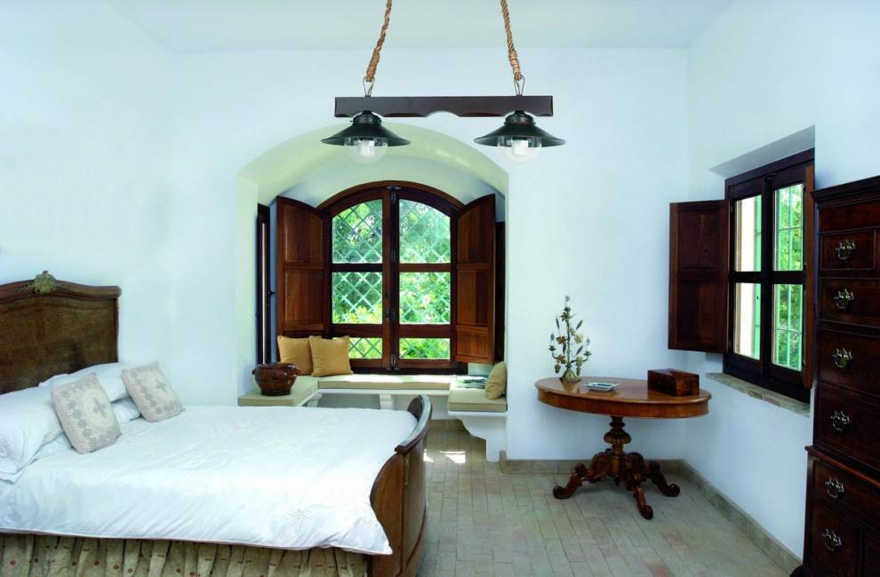 В представленном коттедже в спальне использована легкая прозрачная тюль. И этого достаточно. Она выполняет в основном эстетическую функцию и придает жилье уюта.