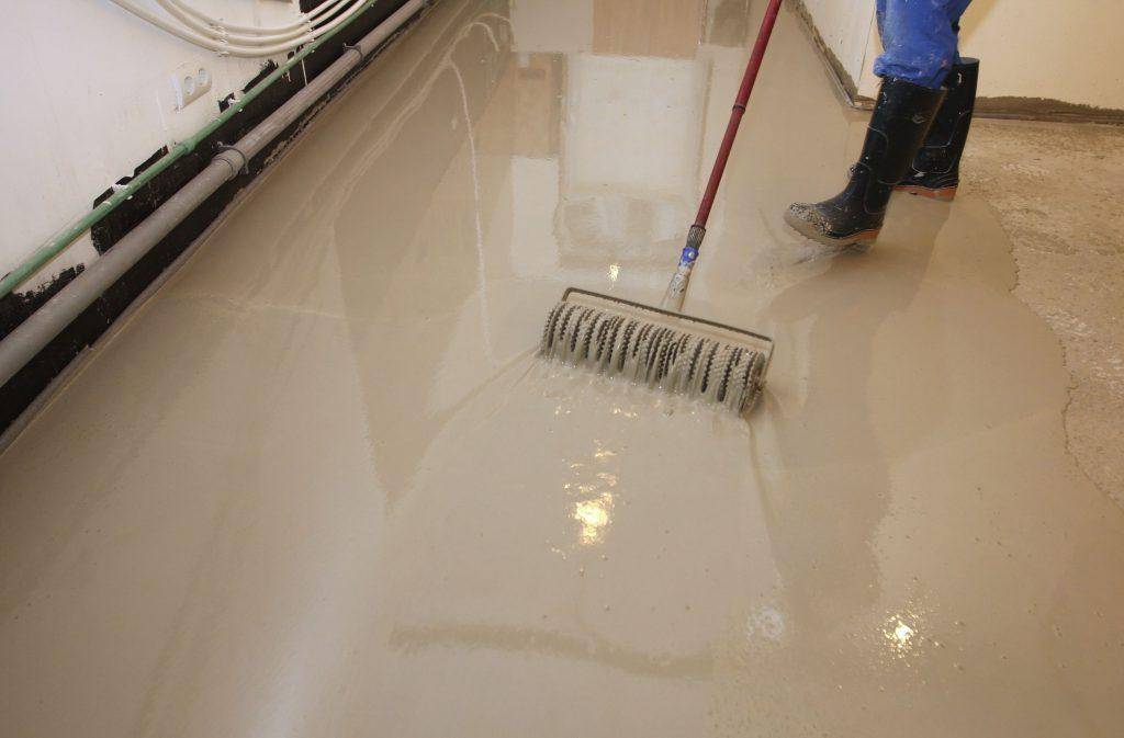 Для заливки используют специальный состав, который разводят водой до консистенции жидкой сметаны. Раствор растекается по поверхности, заполняет мелкие трещины и неровности, для раскатки используют силиконовый ролик с мелкими шипами. Толщина слоя варьируется от 3 до 20 мм, время застывания составляет несколько часов, но для полной полимеризации требуется 7…10 суток.
