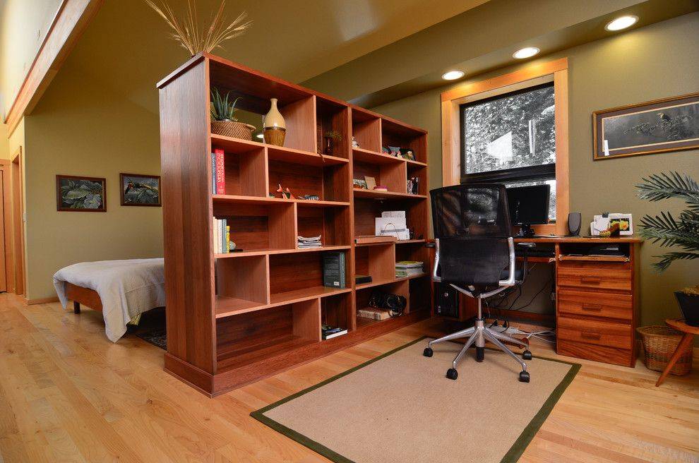 - Если в комнате нужно отгородить кровать, создав спальную зону, устанавливается стеллаж, нижняя часть которого заполнена выдвижными ящичками.