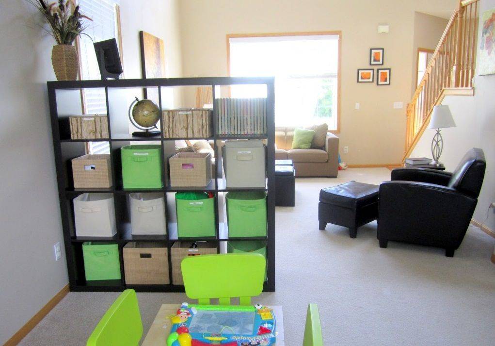 - Детские игрушки. Стеллаж с открытыми полками или ячейками, наполненными детскими игрушками, не только добавит комнате отличного настроения, но и позволит организовать в ней порядок.