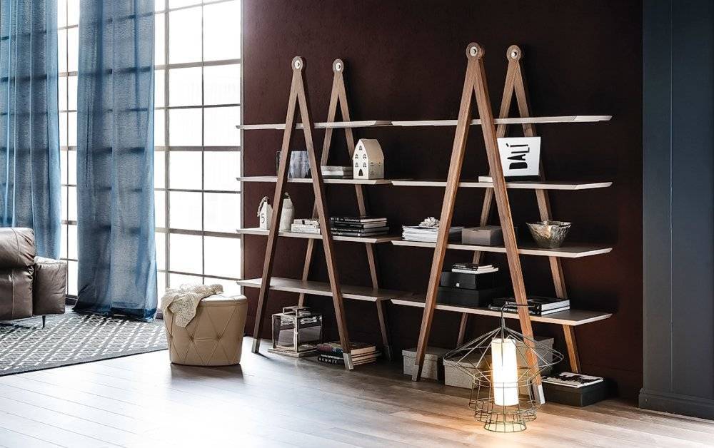 По форме стеллажи тоже могут быть абсолютно разными, что позволяет ставить их в самых потайных или, напротив, самых главных местах в доме. Это может быть компактная этажерка с различным количеством полок или большая единая конструкция с разными по размеру ячейками. Стеллажи могут быть стандартными прямоугольными или, например, треугольными (их обычно располагают под лестницей в доме или на мансардном этаже, где скошены потолки).