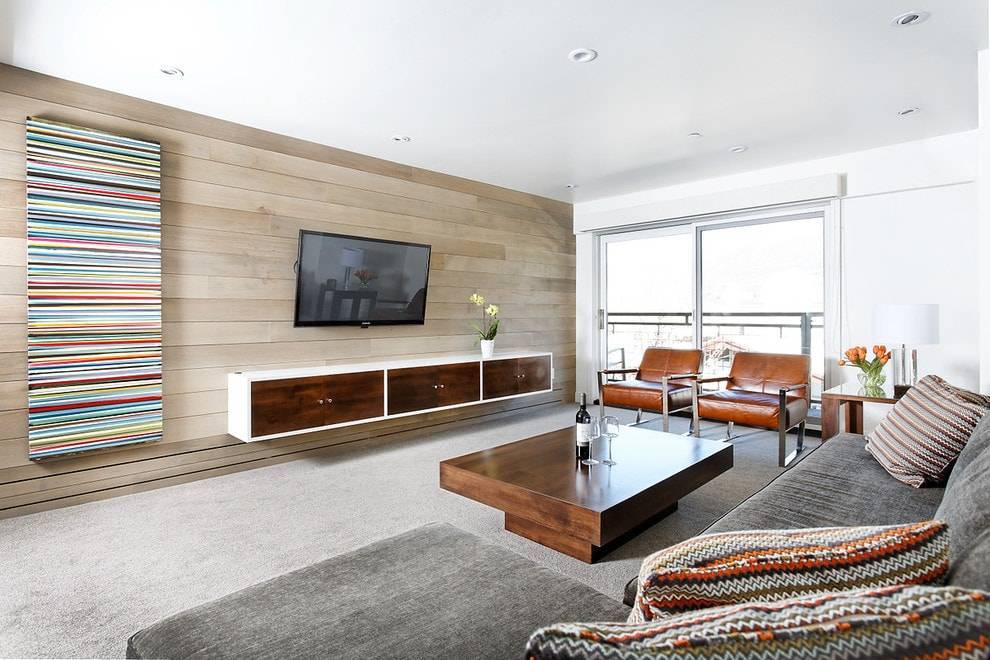 Очень красивый и необычный стиль, имеющий большое количество текстиля и элементов из древесины. Стены отделываются панелями под цвет и фактуру дерева, что гармонично смотрится с размещенной на ней плазмой.